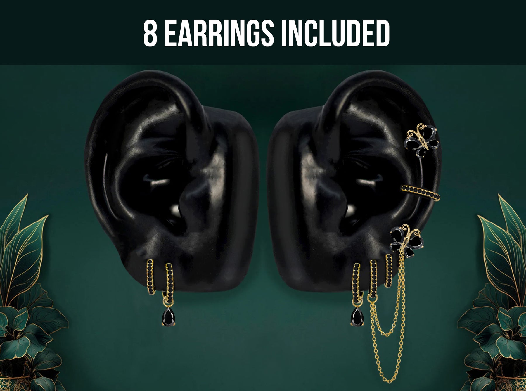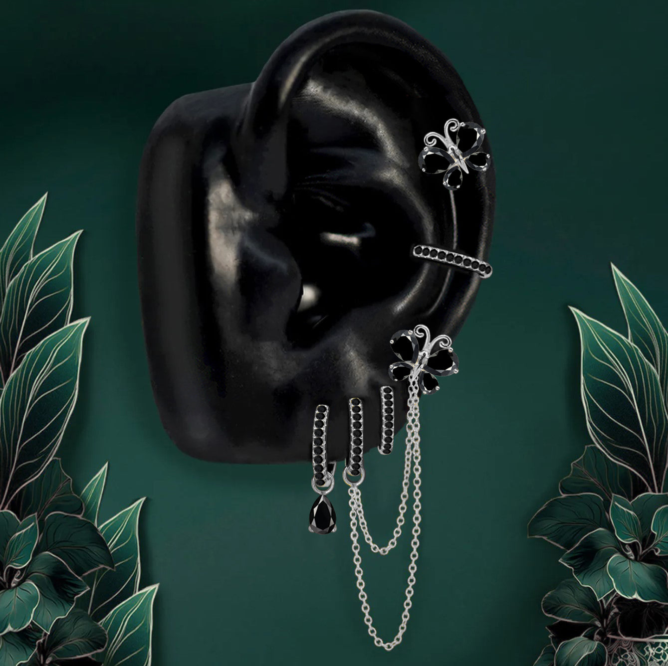 Dark as midnight, luminous as starlight—our butterfly hoop earrings bring elegance with every flutter. Sparkling black stones meet cascading chains, balanced by a dainty butterfly stud earring. Perfect for women who crave fashion jewelry that feels powerful yet graceful. Layer them into a curated ear piercing or gift them as dramatic anniversary jewelry. These are black butterfly earrings designed to stand out. Hypoallergenic Earrings