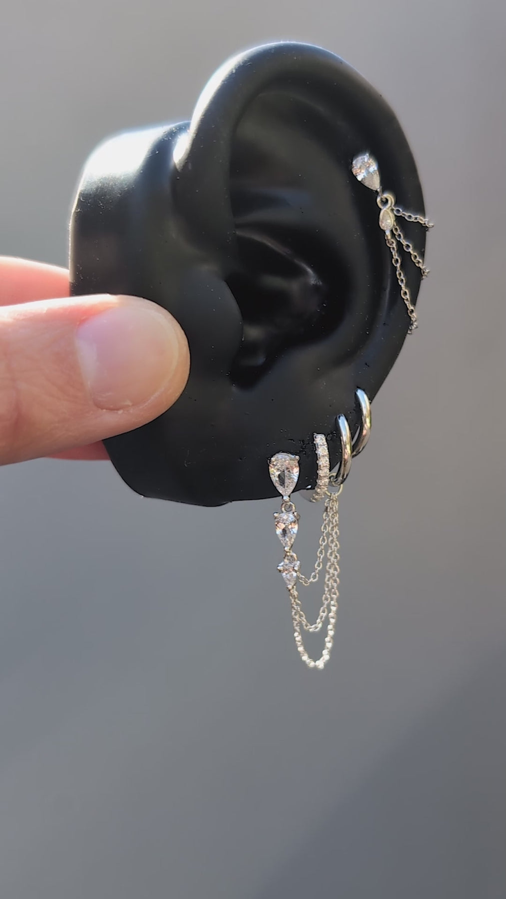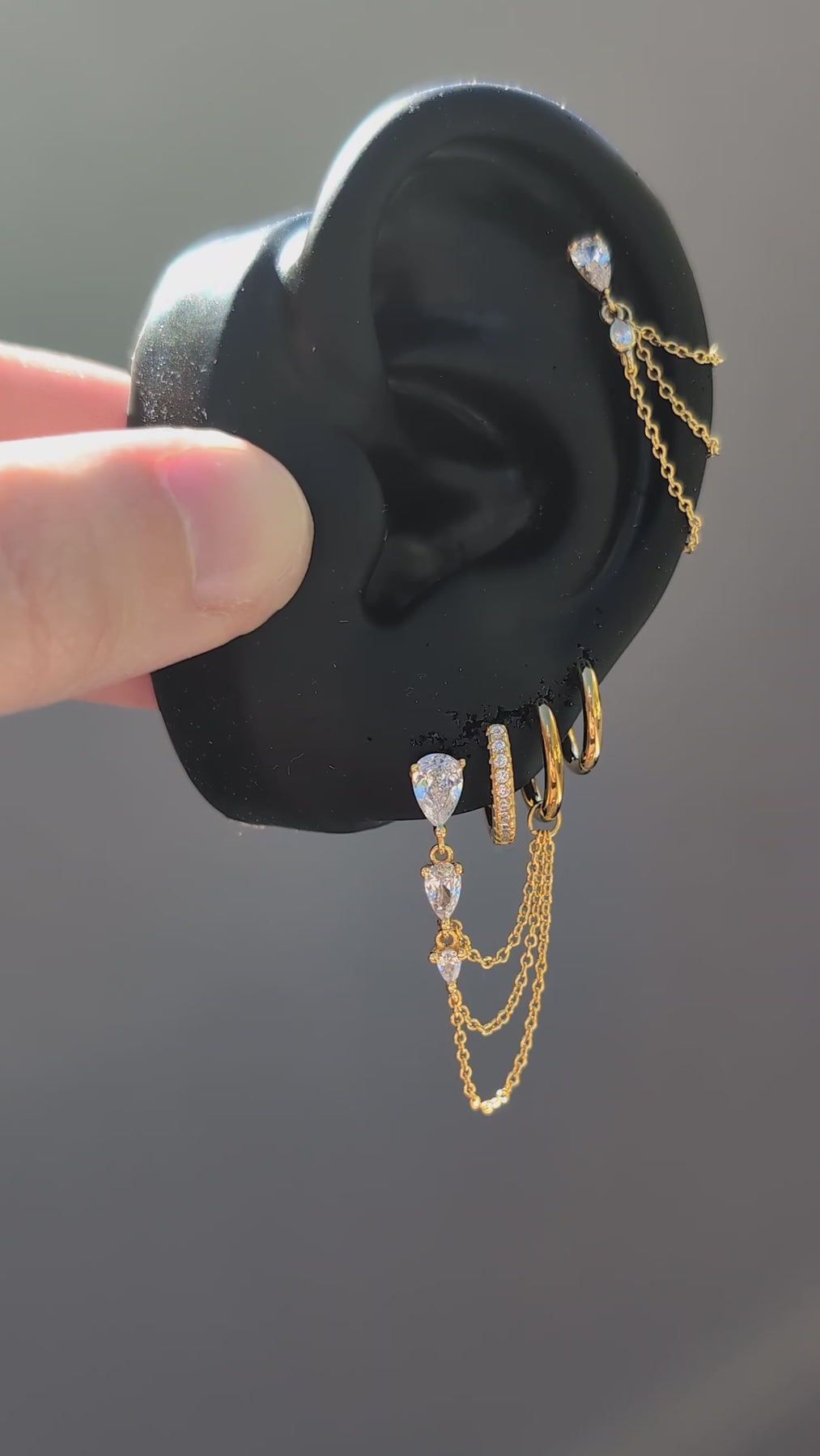 - 2 Pieces, Triple Pear Gems with Triple Chain - double piercing earring.