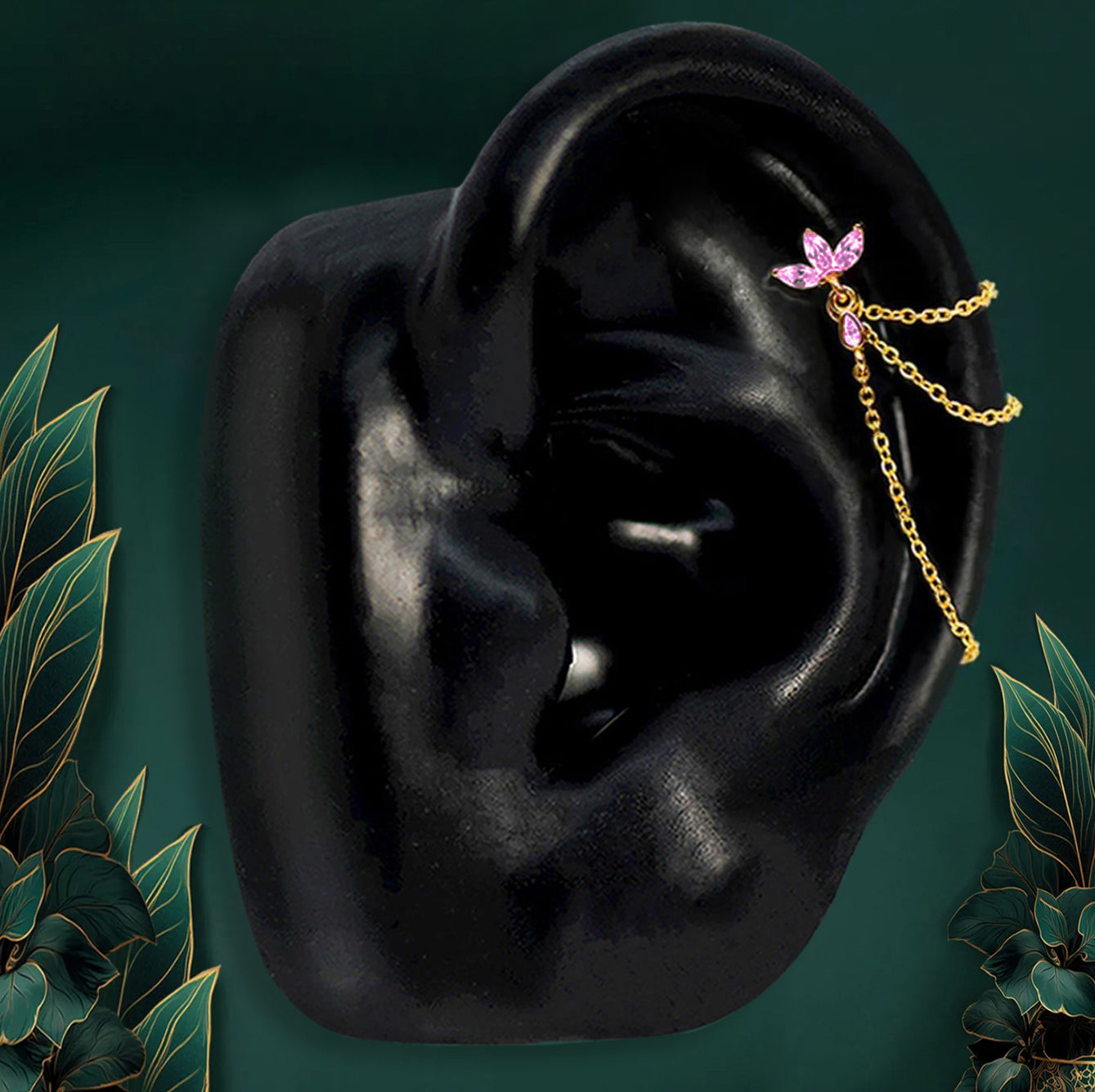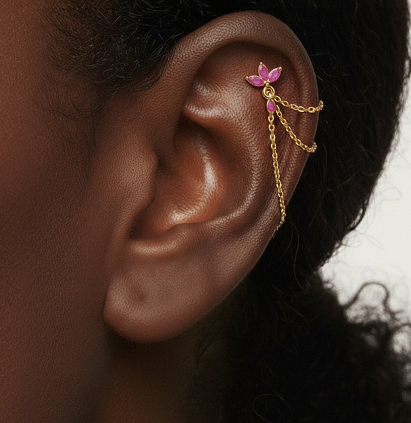 A marquise-cut bloom anchors fine gold chains that fall in soft, luminous lines along the curve of your ear. It lives in the space between the everyday and the extraordinary, glimmering as you move. Elegant, fluid, quietly assured. Wear it on ordinary Tuesdays. Wear it on the days that change everything.