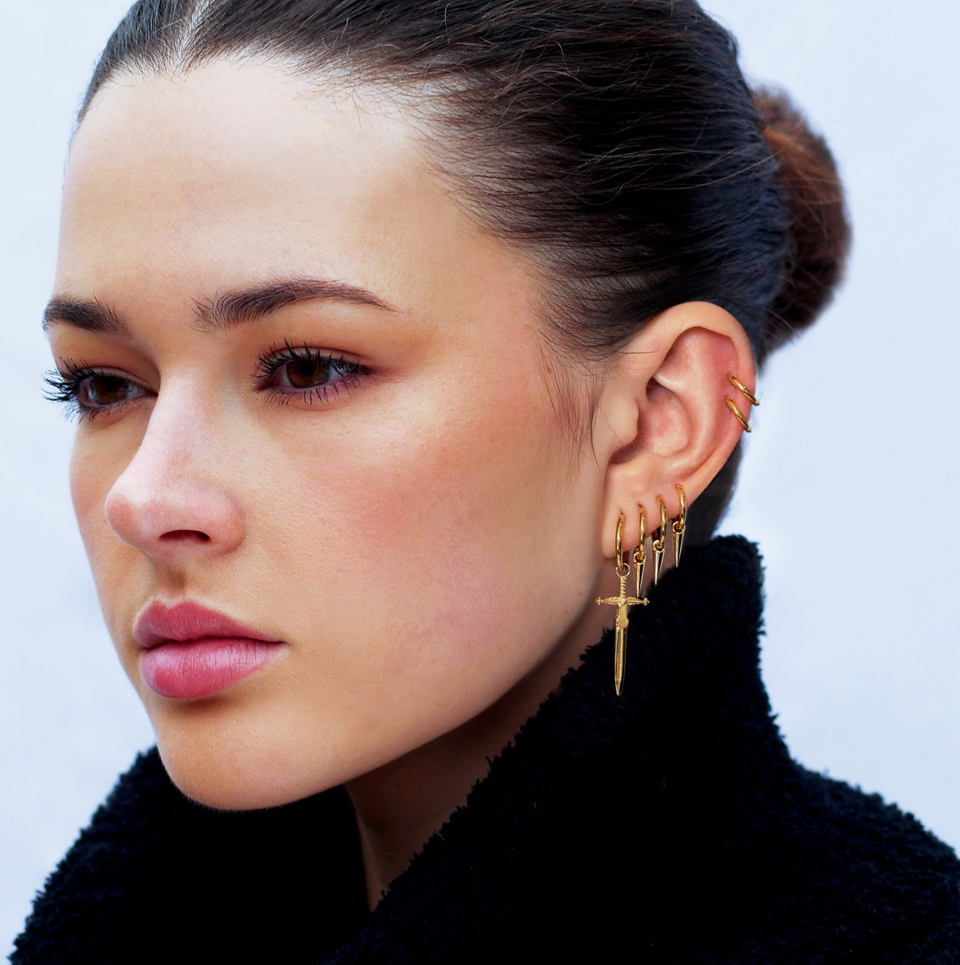 Model wearing gold dagger earrings – striking sword earrings styled as statement jewelry